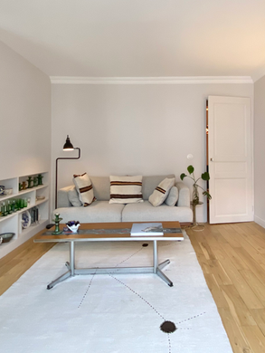 L'objectif de ce projet était avant tout de redonner des proportions fonctionnelles et agréables à cet appartement qui était composé d'un salon trop petit et sombre sans espace salle à manger et d'une chambre très grande. Nous avons choisi de s'affranchir d'une vraie chambre fermée pour créer un grand séjour/salle à manger très lumineux et un espace nuit cocon dans une alcôve avec un grand dressing sur mesure. La tête de lit en menuiserie qui fait office de séparation est composé de rangement hauts et bas, recto verso pour optimiser les rangements. Nous avons poncé le parquet pour l'éclaircir, et choisis pour les murs un blanc cassé clair qui contraste avec le vert olive profond du dressing.